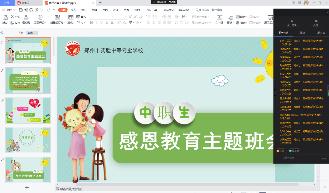 感恩是一种生活态度,是一种美德。感恩应该是社会上每个人应该有的基本道德准则,是做人的起码修养,也是人之常情。对广大青年来说,感恩意识绝不仅是简单的回报父母的养育之恩,它更是一种责任意识、自立意识、自尊意识和健全人格的体现。我校利用各班级晚自习时间,组织开展《感恩教育》主题班会。