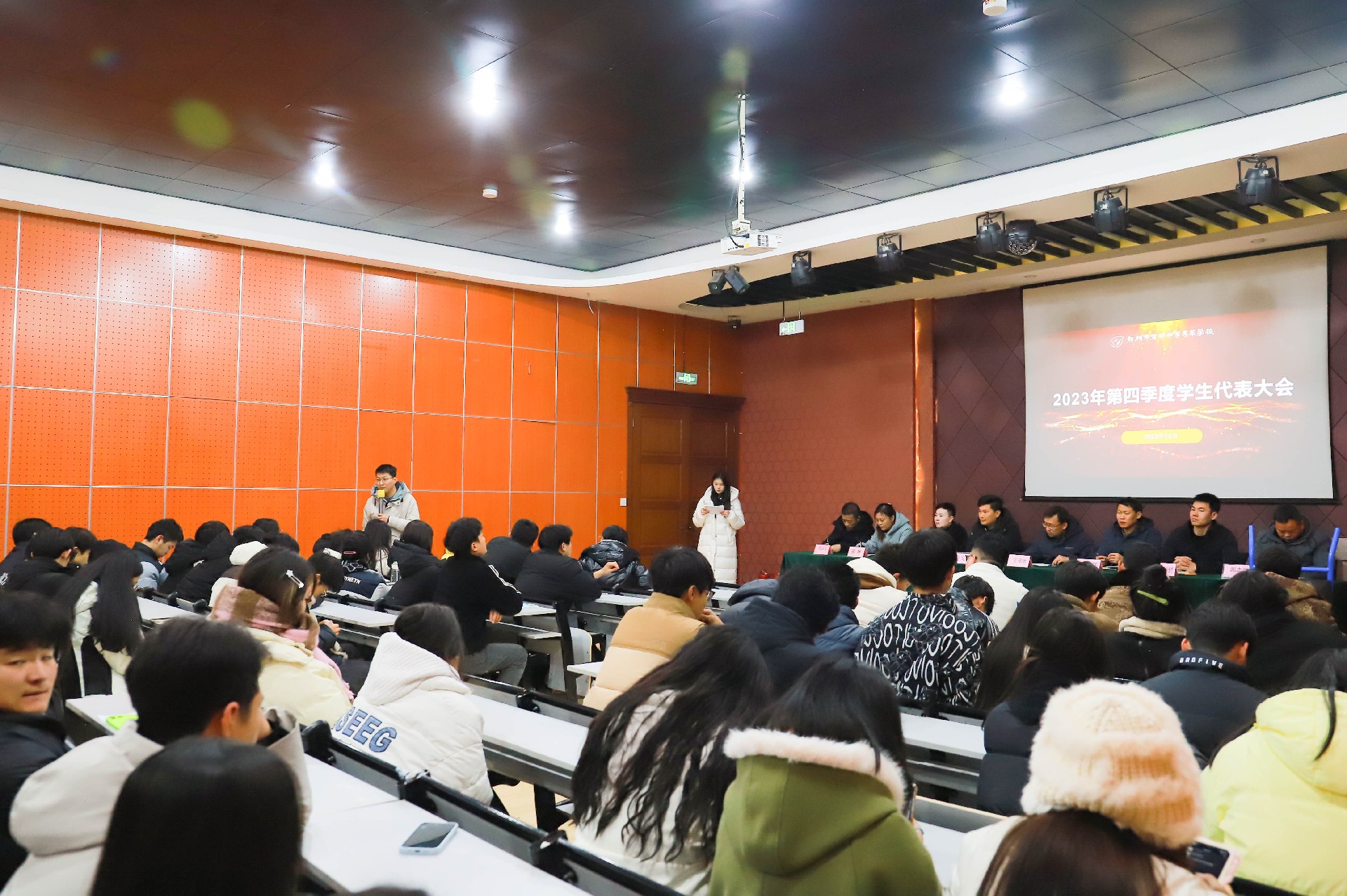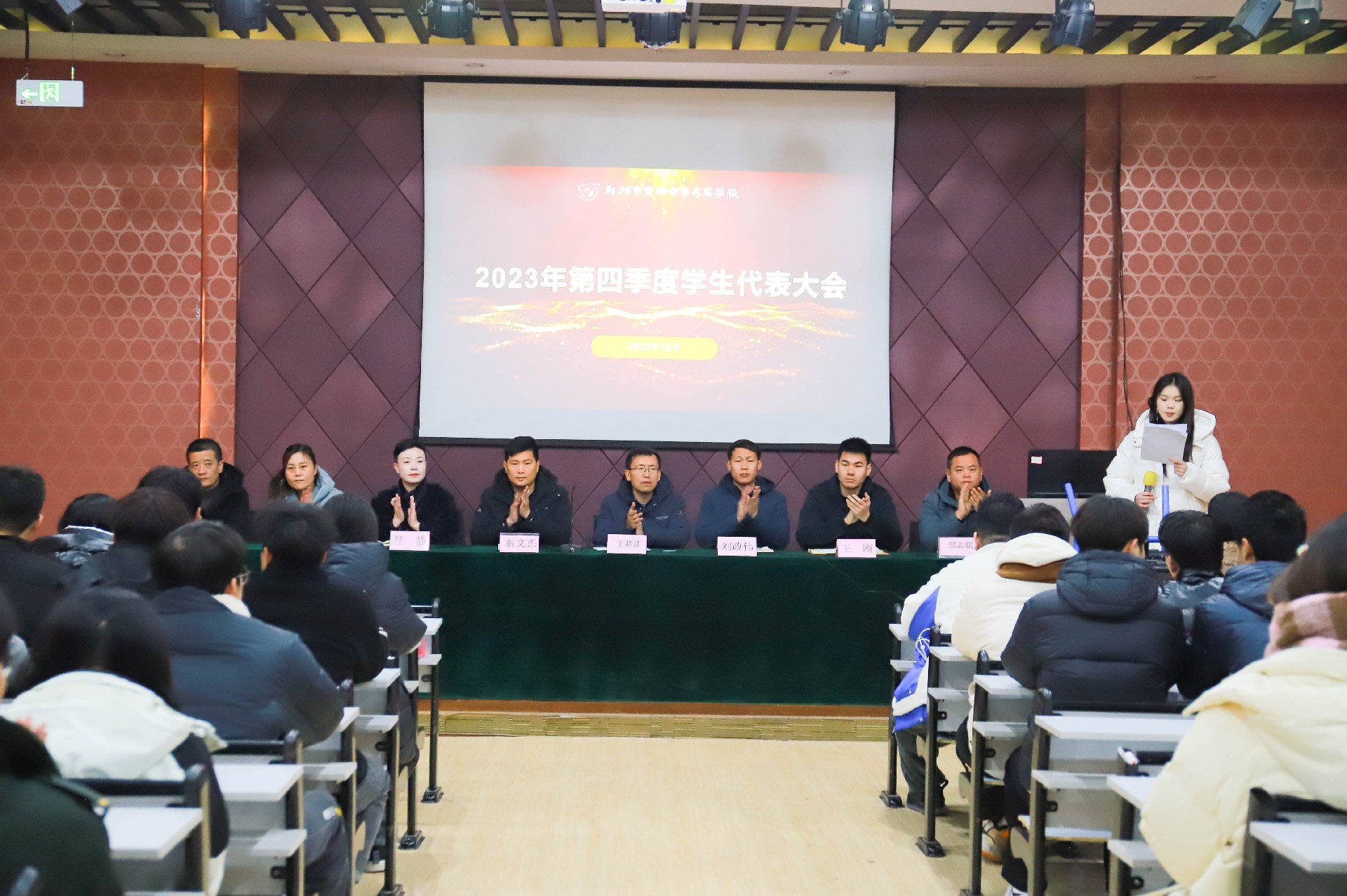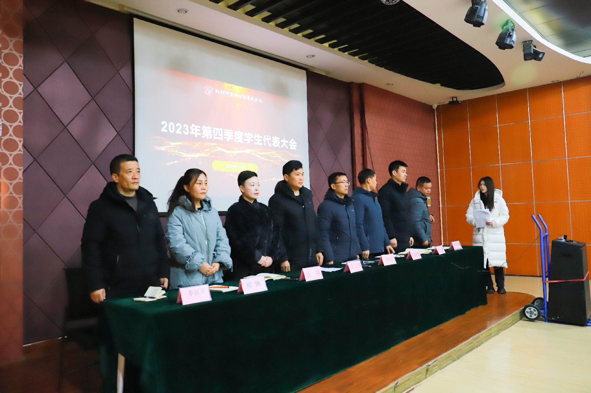 我校第四季度学生代表大会在报告厅隆重召开。本次大会旨在总结过去一季度的各项工作和部署下一阶段的工作计划,旨在促进学校与师生的紧密联系,共同促进学校的发展和学生的成长。王刚书记、秦文杰副校长、王兆法副校长、任静副校长、郝琳副校长、刘政伟主任,以及各部门相关负责人出席会议,全校130名学生代表参加会议