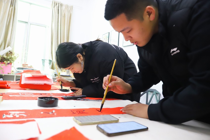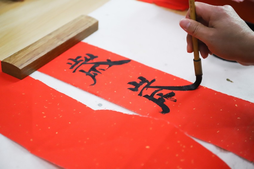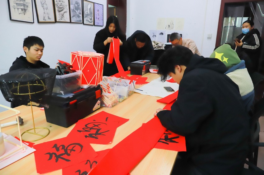 活动当天,校园内弥漫着浓浓的墨香。在创美π社团的教室里,老师和同学们一同沾墨、提笔、挥笔、收笔,如行云流水,将自己对新年的美好祝愿融入到一笔一划中。有的同学写下了“福满人间”,有的写下了“吉祥如意”,还有的写下了“学业进步”等美好祝福。这些春联不仅展现了同学们对幸福生活的深情赞美,更饱含了大家对新年的热切期盼。