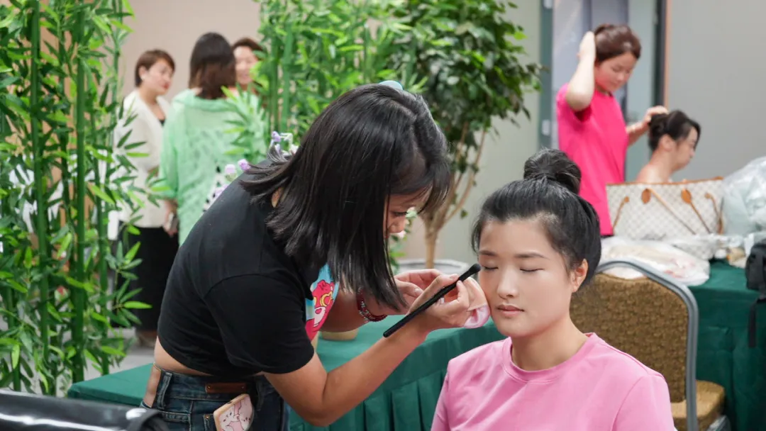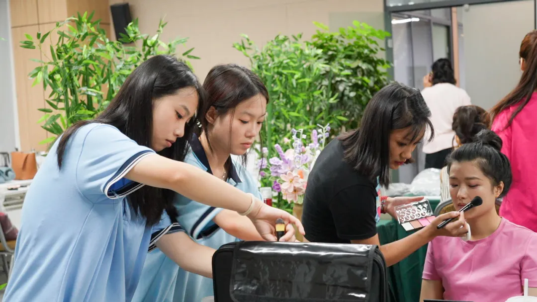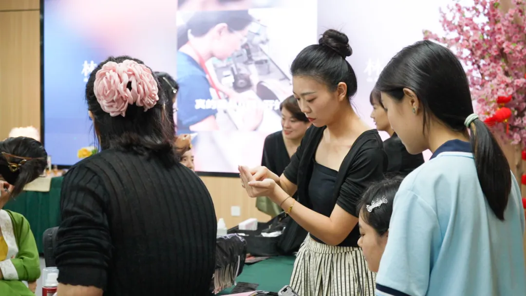 在活动现场,学生们神情专注,手法娴熟。她们根据每位参与者的面部特征、气质以及活动主题,精心设计妆容。从底妆的细腻处理,到眼妆的精致描绘,再到唇色的巧妙搭配,每一个步骤都倾注了她们的专业知识和热情。在与参与者的交流互动中,学生们不仅充分发挥了自己的专业技能,还锻炼了沟通能力和应变能力。她们耐心倾听需求,给出专业建议,力求让每一位参与者都满意而归。