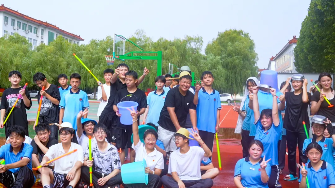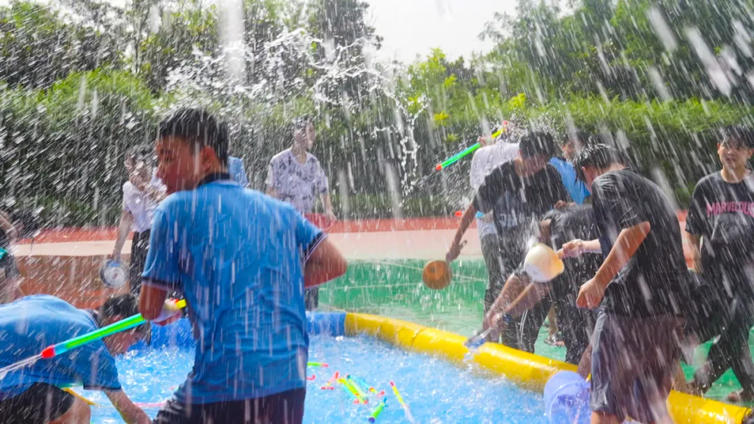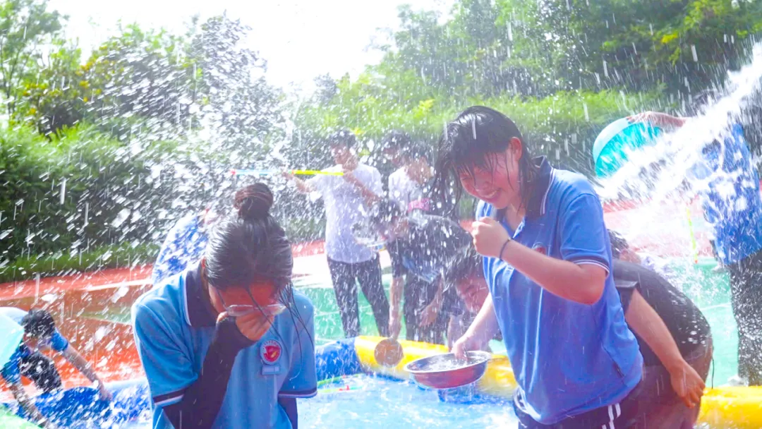 水花四溅,同学们的脸上洋溢着无比的喜悦。他们相互追逐、泼水嬉戏,平日里学习的压力在此刻得到了尽情的释放。老师们也参与其中,与同学们一同享受这欢乐的时刻,师生之间的距离瞬间拉近,整个校园变成了一片欢乐的海洋。