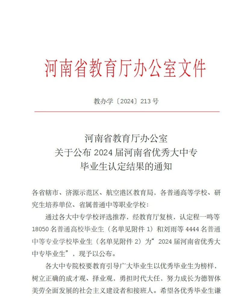 近日,河南省教育厅办公室正式发布了《关于公布2024届河南省优秀大中专毕业生认定结果的通知》(教办学〔2024〕213号),公布了2024届河南省优秀大中专毕业生名单,我校施权恒、归翠云等12名同学荣获“2024届河南省优秀大中专毕业生”荣誉称号。